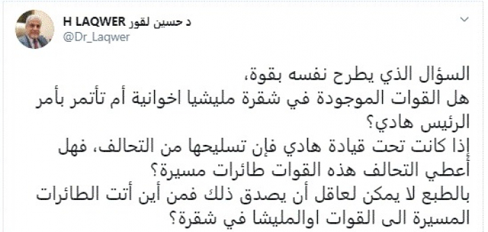 وقال في تغريدة عبر "تويتر" رصدها "المشهد العربي": "السؤال الذي يطرح نفسه بقوة هل القوات الموجودة في شقرة مليشيا إخوانية أم تأتمر بأمر الرئيس هادي؟".