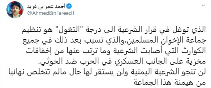 وأضاف: "لن تنجو الشرعية اليمنية ولن يستقر لها حال ما لم تتخلص نهائيًا من هيمنة هذه الجماعة".