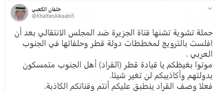 الكعبي لـ قطر: الجنوبيون متمسكون بدولتهم.. وأكاذيبكم ضد الانتقالي لن تغير شيئًا