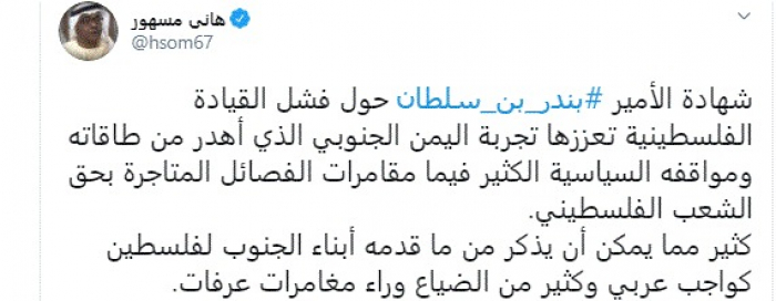 وقال في تغريدة عبر "تويتر" رصدها "المشهد العربي": "شهادة الأمير بندر بن سلطان حول فشل القيادة الفلسطينية تعززها تجربة اليمن الجنوبي الذي أهدر من طاقاته ومواقفه السياسية الكثير فيما مقامرات الفصائل المتاجرة بحق الشعب الفلسطيني".