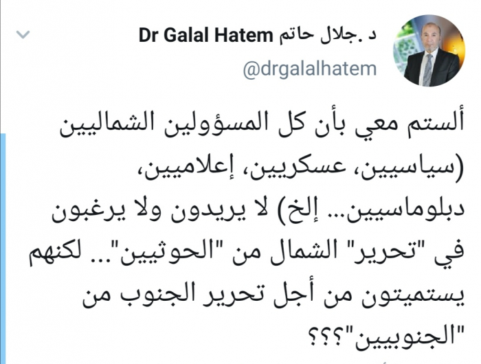 وقال حاتم في تغريدة له عبر حسابه بتويتر ورصدها "المشهد العربي": ألستم معي بأن كل المسؤولين الشماليين (سياسيين، عسكريين، إعلاميين، دبلوماسيين... إلخ) لا يريدون ولا يرغبون في "تحرير" الشمال من "الحوثيين"... لكنهم يستميتون من أجل تحرير الجنوب من "الجنوبيين"؟.