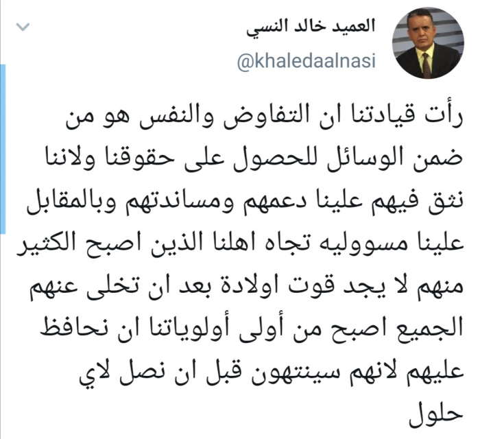 وقال النسي في تغريدة له عبر حسابه بتويتر ورصدها "المشهد العربي": "رأت قيادتنا أن التفاوض والنفس هو من ضمن الوسائل للحصول على حقوقنا".