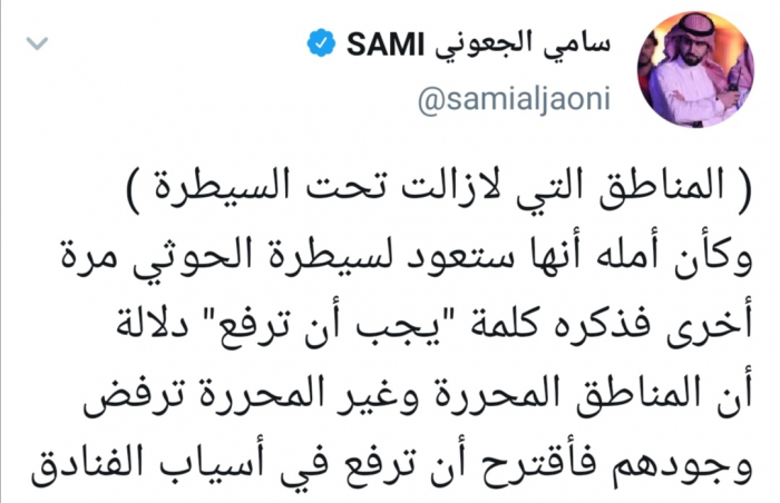 وقال الجعوني في تغريدة له عبر حسابه بتويتر ورصدها "المشهد العربي" : "( المناطق التي لازالت تحت السيطرة ) وكأن أمله أنها ستعود لسيطرة الحوثي مرة أخرى فذكره كلمة "يجب أن ترفع" دلالة على أن المناطق المحررة وغير المحررة ترفض وجودهم فأقترح أن ترفع في أسياب الفنادق".