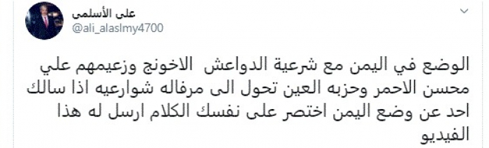 وقال في تغريدة عبر "تويتر" رصدها "المشهد العربي": "الوضع في اليمن مع شرعية الدواعش الإخونج وزعيمهم علي محسن الأحمر وحزبه اللعين تحول إلى مرفالة شوارعية إذا سألك أحد عن وضع اليمن اختصر على نفسك الكلام أرسل له هذا الفيديو".