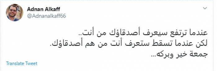 وكتب في تغريدة عبر "تويتر" رصدها "المشهد العربي": "عندما ترتفع سيعرف أصدقاؤك من أنت.. لكن عندما تسقط ستعرف أنت من هم أصدقاؤك. جمعة خير وبركة".