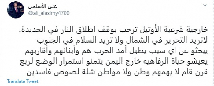 وقال في تغريدة عبر "تويتر" رصدها "المشهد العربي": "خارجية شرعية الأوتيل ترحب بوقف إطلاق النار في الحديدة، لا تريد التحرير في الشمال ولا تريد السلام في الجنوب".