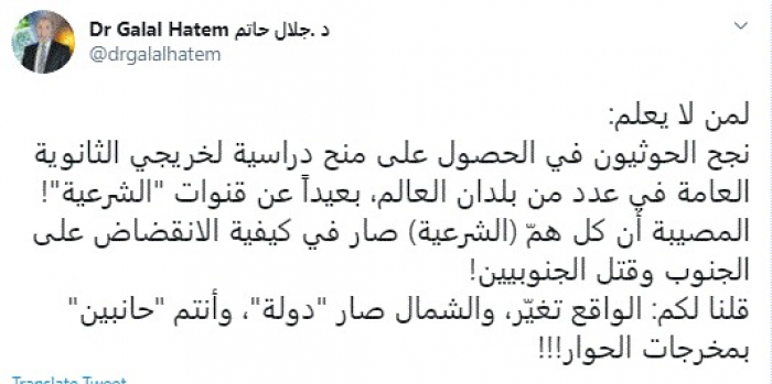 وقال في تغريدة عبر "تويتر" رصدها "المشهد العربي": "لمن لا يعلم: نجح الحوثيون في الحصول على منح دراسية لخريجي الثانوية العامة في عدد من بلدان العالم، بعيدًا عن قنوات الشرعية".