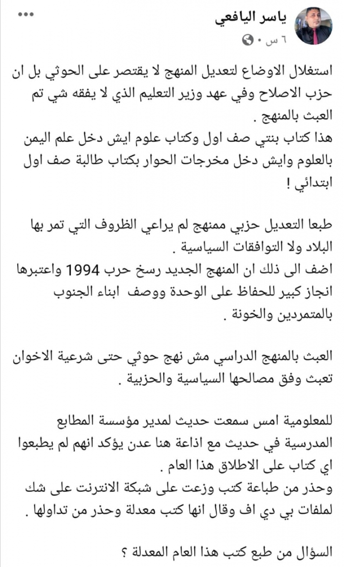 وقال اليافعي في تغريدة له عبر حسابه بتويتر رصدها "المشهد العربي" إن "استغلال الأوضاع لتعديل المنهج لا يقتصر على الحوثي بل إن حزب الإصلاح وفي عهد وزير التعليم الذي لا يفقه شيئا تم العبث بالمنهج".