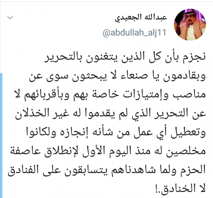 وكتب الجعيدي عبر تغريدة له على "تويتر" رصدها "المشهد العربي": "نجزم بأن كل الذين يتغنون بالتحرير وبقادمون يا صنعاء لا يبحثون سوى عن مناصب وامتيازات خاصة بهم وبأقربائهم، لا عن التحرير الذي لم يقدموا له غير الخذلان وتعطيل أي عمل من شأنه إنجازه".
