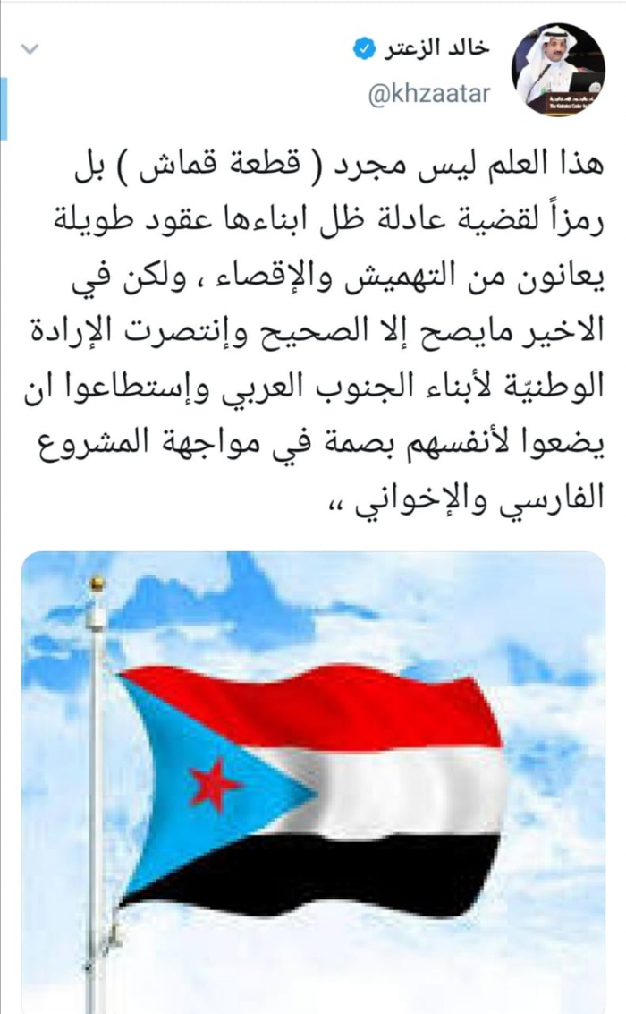وأضاف الزعتر عبر تغريدة له على "تويتر" رصدها "المشهد العربي": "ما يصح إلا الصحيح وانتصرت الإرادة الوطنيّة لأبناء الجنوب العربي واستطاعوا أن يضعوا لأنفسهم بصمة في مواجهة المشروع الفارسي والإخواني".
