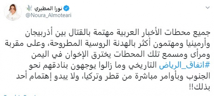وقالت في تغريدة عبر "تويتر" رصدها "المشهد العربي": "جميع محطات الأخبار العربية مهتمة بالقتال بين أذربيجان وأرمينيا ومهتمون أكثر بالهدنة الروسية المطروحة".