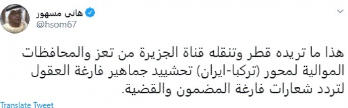 وقال في تغريدة عبر "تويتر" رصدها "المشهد العربي": "هذا ما تريده قطر وتنقله قناة الجزيرة من تعز والمحافظات الموالية لمحور (تركيا- إيران) تحشييد جماهير فارغة العقول لتردد شعارات فارغة المضمون والقضية".
