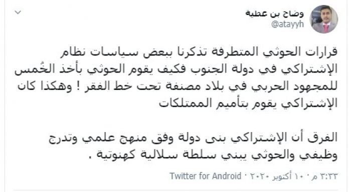 وكتب "بن عطية" تغريدة عبر تويتر، رصدها "المشهد العربي": "قرارات الحوثي المتطرفة تذكرنا ببعض سياسات نظام الاشتراكي في دولة الجنوب فكيف يقوم الحوثي بأخذ الخُمس للمجهود الحربي في بلاد مصنفة تحت خط الفقر".