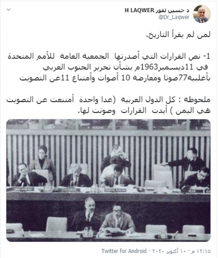 وكتب "لقور" تغريدة عبر تويتر، رصدها "المشهد العربي": "لمن لم يقرأ التاريخ.. نص القرارات التي اْصدرتها الجمعية العامة للاْمم المتحدة في 11ديسمبر1963م بشاْن تحرير الجنوب العربي باْغلبية77 صوتا ومعارضة 10 اْصوات واْمتناع 11عن التصويت".