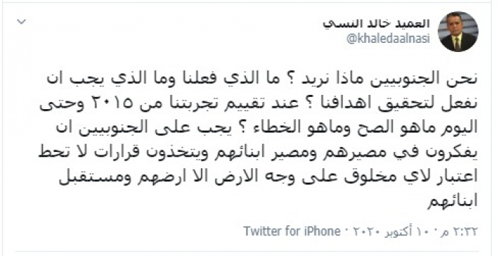 وكتب "النسي" تغريدة عبر تويتر، رصدها "المشهد العربي": "نحن الجنوبيين ماذا نريد ؟ ما الذي فعلنا وما الذي يجب أن نفعل لتحقيق اهدافنا ؟".