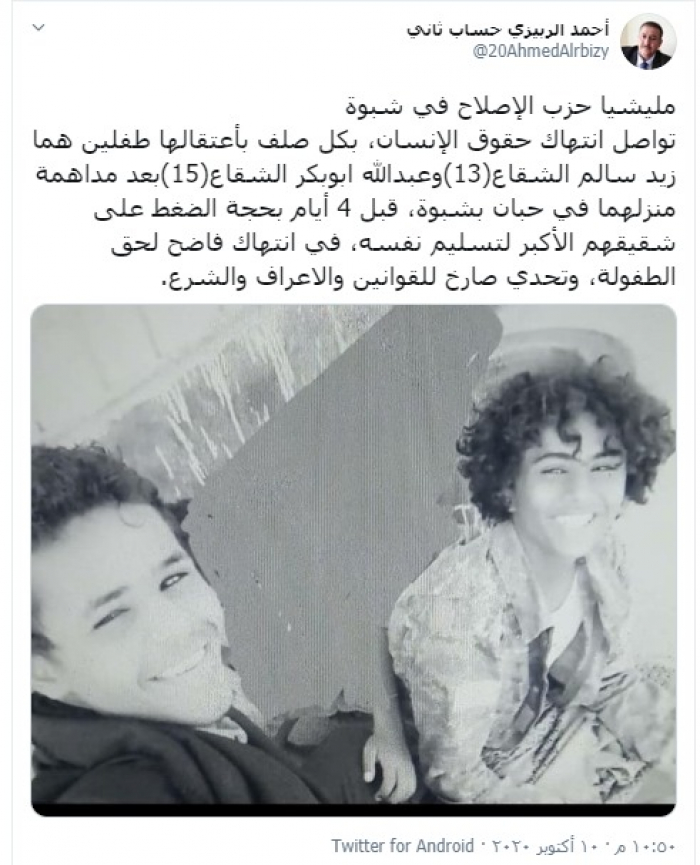 وكتب "الربيزي" تغريدة عبر تويتر، رصدها "المشهد العربي": "مليشيا حزب الإصلاح في شبوة تواصل انتهاك حقوق الإنسان، بكل صلف باعتقالها طفلين هما زيد سالم الشقاع(13) عاما وعبدالله أبوبكر الشقاع(15) عاما بعد مداهمة منزلهما في حبان بشبوة، قبل 4 أيام بحجة الضغط على شقيقهما الأكبر لتسليم نفسه، في انتهاك فاضح لحق الطفولة، وتحد صارخ للقوانين والأعراف والشرع".