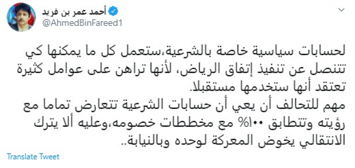 بن فريد: الشرعية ستتنصل من اتفاق الرياض.. وأجنداتها تتطابق مع مخططات خصوم التحالف