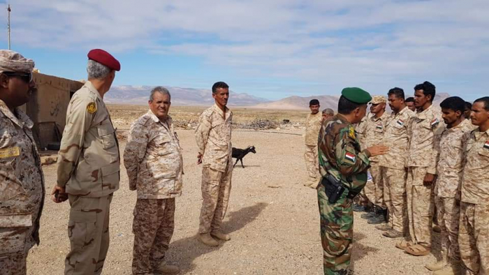 تفقد أركان حرب اللواء الأول مشاة بحري في سقطرى، العميد محسن حسن حمود، خلال زيارته الكتيبة الأولى بقلنسية وسرية الهندسة، اليوم الأحد، مدى جاهزية القوات.