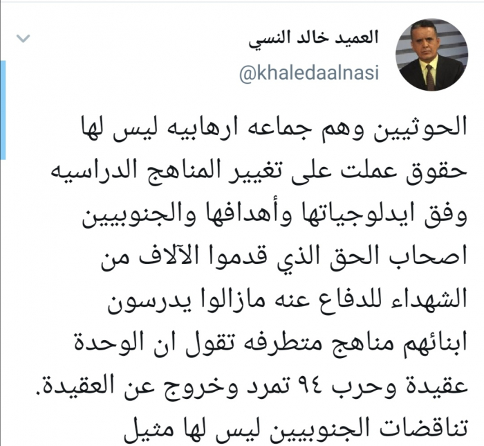 وكتب النسي في تغريدة له عبر "تويتر" رصدها "المشهد العربي": "الحوثيون وهم جماعة إرهابية ليس لها حقوق عملت على تغيير المناهج الدراسية وفق أيدلوجياتها وأهدافها".