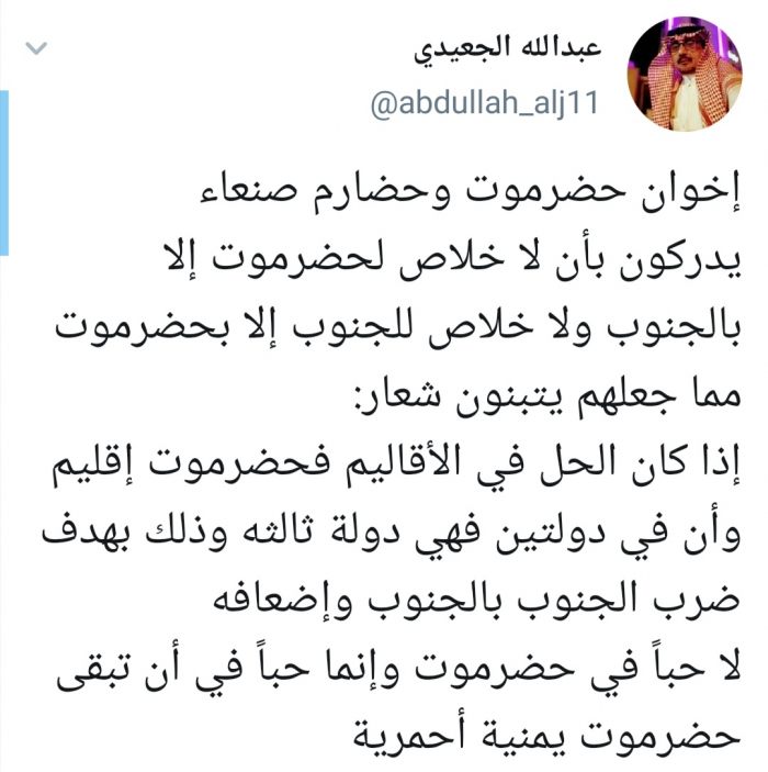وتابع الجعيدي تغريدته: "لا حبًا في حضرموت وإنما حب في أن تبقى حضرموت يمنية أحمرية".
