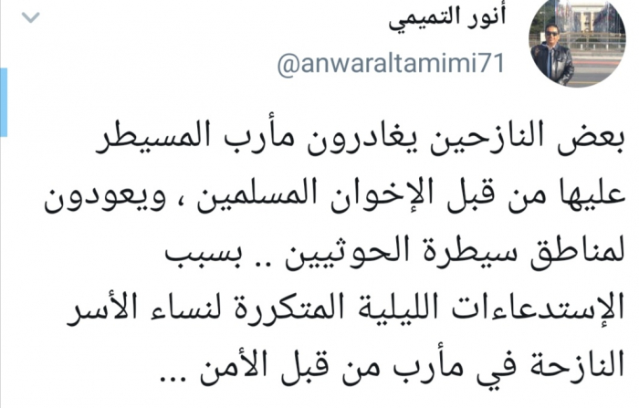 وقال التميمي في تغريدة له عبر حسابه بتويتر رصدها "المشهد العربي": "بعض النازحين يغادرون مأرب المسيطر عليها من قبل الإخوان المسلمين ، ويعودون لمناطق سيطرة الحوثيين بسبب الاستدعاءات الليلية المتكررة لنساء الأسر النازحة في مأرب من قبل الأمن".