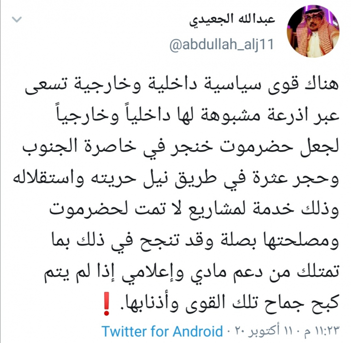 وأضاف الجعيدي عبر تغريدة له على "تويتر" رصدها "المشهد العربي" أن "ذلك خدمة لمشاريع لا تمت لحضرموت ومصلحتها بصلة وقد تنجح في ذلك بما تمتلك من دعم مادي وإعلامي إذا لم يتم كبح جماح تلك القوى وأذنابها".