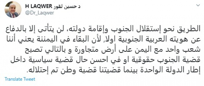 وقال في تغريدة عبر "تويتر" رصدها "المشهد العربي": "الطريق نحو استقلال الجنوب وإقامة دولته، لن يتأتى إلا بالدفاع عن هويته العربية الجنوبية أولًا".