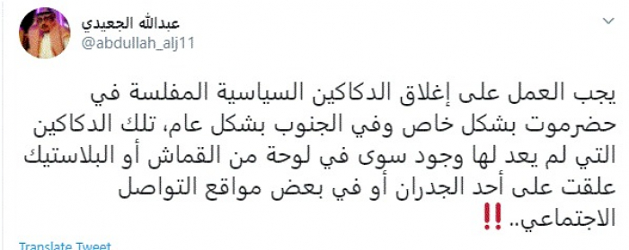 وقال في تغريدة عبر "تويتر" رصدها "المشهد العربي": "يجب العمل على إغلاق الدكاكين السياسية المفلسة في حضرموت بشكل خاص وفي الجنوب بشكل عام، تلك الدكاكين التي لم يعد لها وجود سوى في لوحة من القماش أو البلاستيك علقت على أحد الجدران أو في بعض مواقع التواصل الاجتماعي".