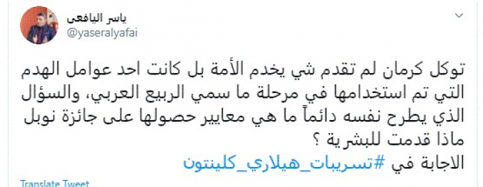 وقال في تغريدة عبر "تويتر" رصدها "المشهد العربي": "توكل كرمان لم تقدم شيء يخدم الأمة بل كانت أحد عوامل الهدم التي تم استخدامها في مرحلة ما سمي الربيع العربي".