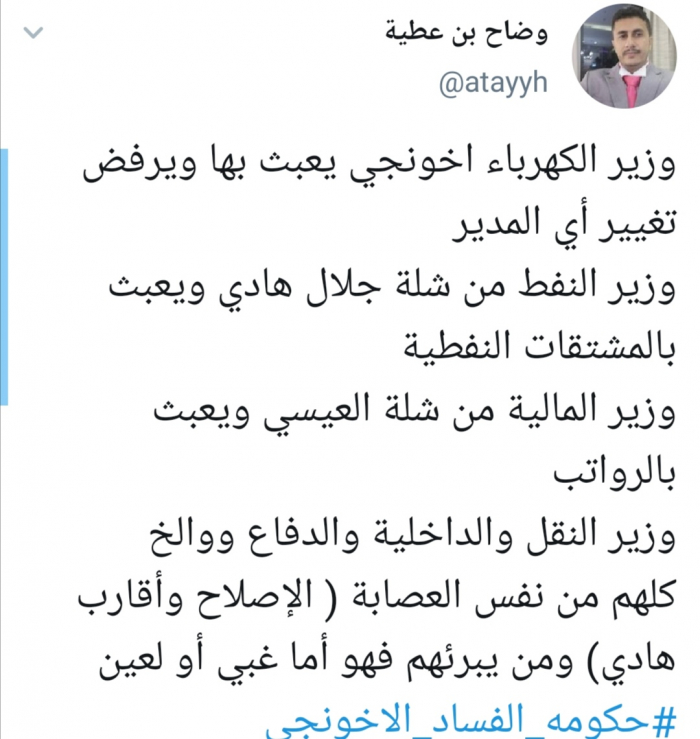 وأضاف بن عطية: "وزير المالية من شلة العيسي ويعبث بالرواتب، وزير النقل والداخلية والدفاع ووالخ كلهم من نفس العصابة ( الإصلاح وأقارب هادي)".