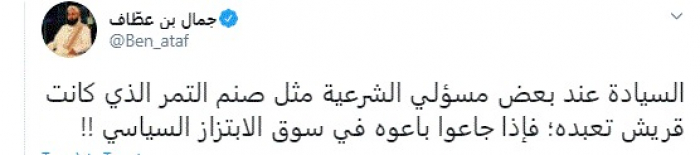 وقال في تغريدة عبر "تويتر" رصدها "المشهد العربي": "السيادة عند بعض مسؤولي الشرعية مثل صنم التمر الذي كانت قريش تعبده؛ فإذا جاعوا باعوه في سوق الابتزاز السياسي".