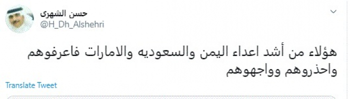 وقال في تغريدة عبر "تويتر" رصدها "المشهد العربي": "هؤلاء من أشد أعداء اليمن والسعودية والإمارات فاعرفوهم واحذروهم وواجهوهم".