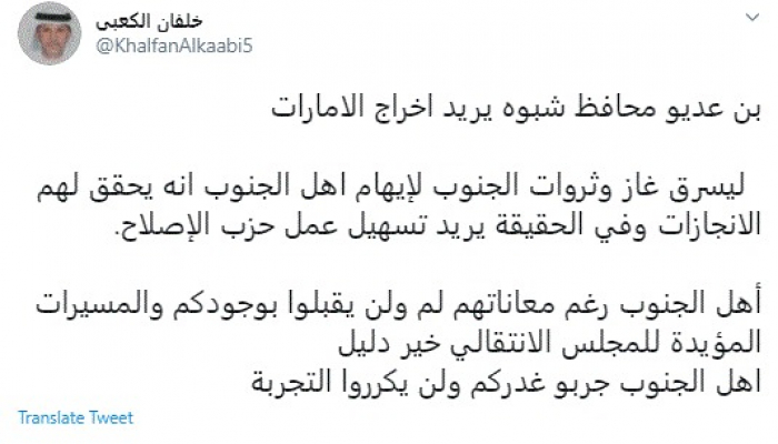 وكتب في تغريدة عبر "تويتر" رصدها "المشهد العربي": "بن عديو محافظ شبوة يريد إخراج الإمارات ليسرق غاز وثروات الجنوب لإيهام أهل الجنوب أنه يحقق لهم الإنجازات وفي الحقيقة يريد تسهيل عمل حزب الإصلاح".