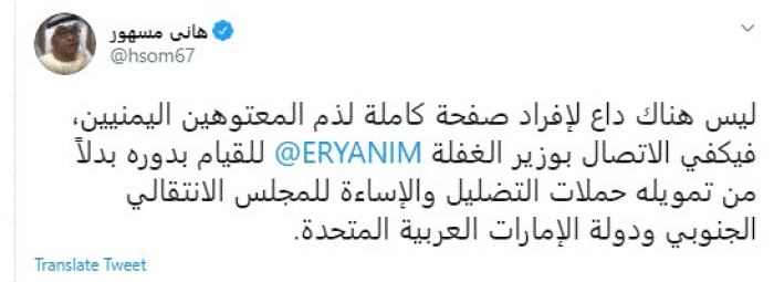 وقال في تغريدة عبر "تويتر" رصدها "المشهد العربي": "ليس هناك داع لإفراد صفحة كاملة لذم المعتوهين اليمنيين، فيكفي الاتصال بوزير الغفلة معمر الإرياني للقيام بدوره بدلًا من تمويله حملات التضليل والإساءة للمجلس الانتقالي الجنوبي ودولة الإمارات العربية المتحدة".