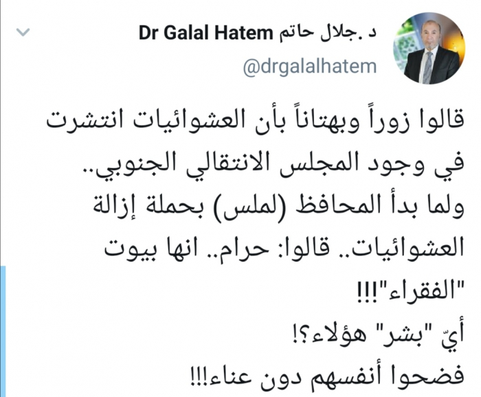 وقال حاتم في تغريدة له عبر حسابه بتويتر ورصدها "المشهد العربي" : "قالوا زورا وبهتانا بأن العشوائيات انتشرت في وجود المجلس الانتقالي الجنوبي.. ولما بدأ المحافظ (لملس) بحملة إزالة العشوائيات.. قالوا: حرام.. إنها بيوت "الفقراء".