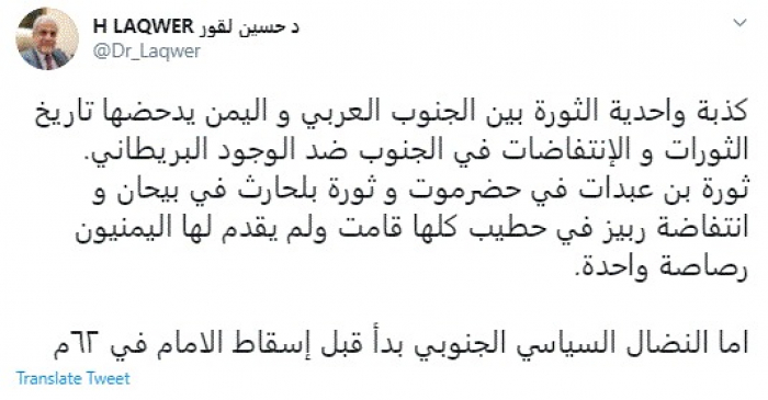 وكتب في تغريدة عبر "تويتر" رصدها "المشهد العربي": "كذبة واحدية الثورة بين الجنوب العربي واليمن يدحضها تاريخ الثورات والانتفاضات في الجنوب ضد الوجود البريطاني".