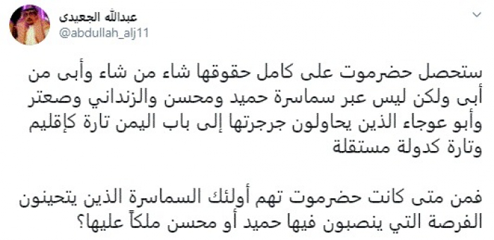 وكتب في تغريدة عبر "تويتر" رصدها "المشهد العربي": "ستحصل حضرموت على كامل حقوقها شاء من شاء وأبى من أبى ولكن ليس عبر سماسرة حميد ومحسن والزنداني وصعتر وأبو عوجاء الذين يحاولون جرجرتها إلى باب اليمن تارة كإقليم وتارة كدولة مستقلة".