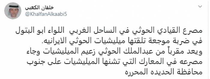 وقال في تغريدة عبر "تويتر" رصدها "المشهد العربي": "مصرع القيادي الحوثي في الساحل الغربي اللواء أبو البتول في ضربة موجعة تلقتها مليشيات الحوثي الإيرانية".