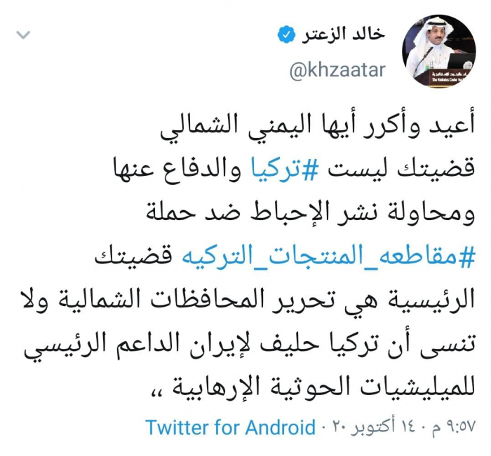 وكتب الزعتر عبر تغريدة له على "تويتر" رصدها "المشهد العربي": "أعيد وأكرر أيها اليمني الشمالي قضيتك ليست تركيا والدفاع عنها ومحاولة نشر الإحباط ضد حملة مقاطعة المنتجات التركية".