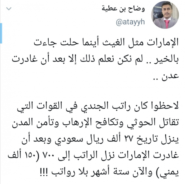 وأوضح بن عطية أن "راتب الجندي في القوات التي تقاتل الحوثي وتكافح الإرهاب وتأمن المدن ينزل تاريخ 27 ألف ريال سعودي وبعد أن غادرت الإمارات نزل الراتب إلى 700 (150 ألف يمني) والآن ستة أشهر بلا رواتب".