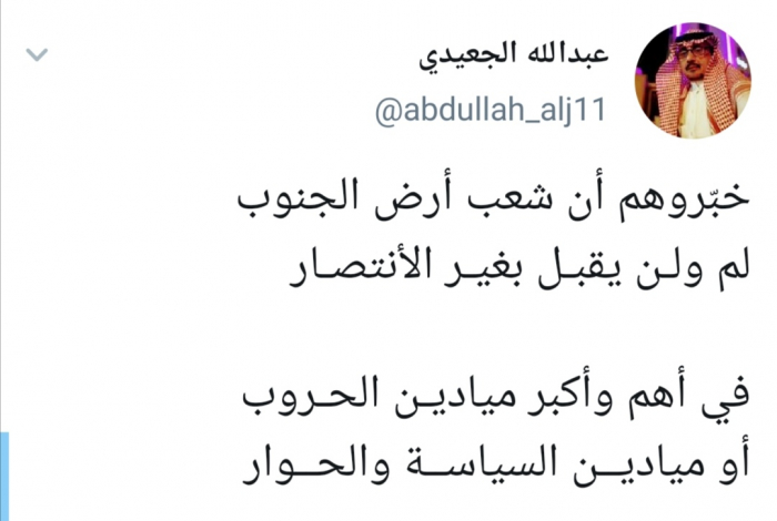 أشاد الشاعر عبد الله الجعيدي، بطبيعة الشعب الجنوبي، وقال إنه لن يقبل بغير الانتصار في ميادين الحروب والسياسة.