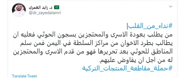 وقال في تغريدة عبر "تويتر" رصدها "المشهد العربي": "من يطلب بعودة الاسرى والمحتجزين بسجون الحوثي فعليه أن يطالب بطرد الإخوان من مراكز السلطة في اليمن فمن سلم المناطق للحوثي بعد تحريرها فهو من قدم الاسرى والمحتجزين له من أجل أن يفاوض عليهم".