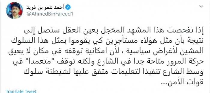 وقال في تغريدة عبر "تويتر" رصدها "المشهد العربي": "إذا تفحصت هذا المشهد المخجل بعين العقل ستصل إلى نتيجة بأن مثل هؤلاء مستأجرين كي يقوموا بمثل هذا السلوك المشين لأغراض سياسية".