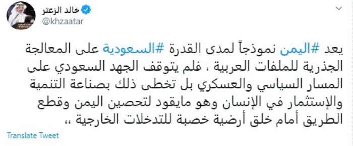 وقال في تغريدة عبر "تويتر" رصدها "المشهد العربي": "يعد اليمن نموذجًا لمدى القدرة السعودية على المعالجة الجذرية للملفات العربية، فلم يتوقف الجهد السعودي على المسار السياسي والعسكري".