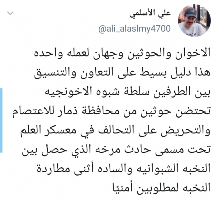 وقال الأسلمي في تغريدة له عبر حسابه بتويتر ورصدها "المشهد العربي": الإخوان والحوثيون وجهان لعملة واحدة هذا دليل بسيط على التعاون والتنسيق بين الطرفين".