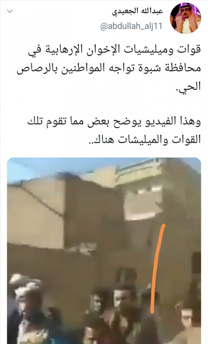وكتب الجعيدي عبر تغريدة له على "تويتر" رصدها "المشهد العربي": "قوات ومليشيات الإخوان الإرهابية في محافظة شبوة تواجه المواطنين بالرصاص الحي".