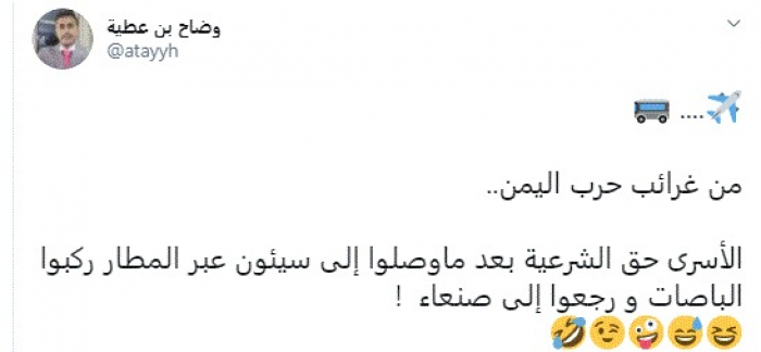 وقال في تغريدة عبر "تويتر" رصدها "المشهد العربي": "من غرائب حرب اليمن.. الأسرى حق الشرعية بعد ما وصلوا إلى سيئون عبر المطار ركبوا الباصات ورجعوا إلى صنعاء".