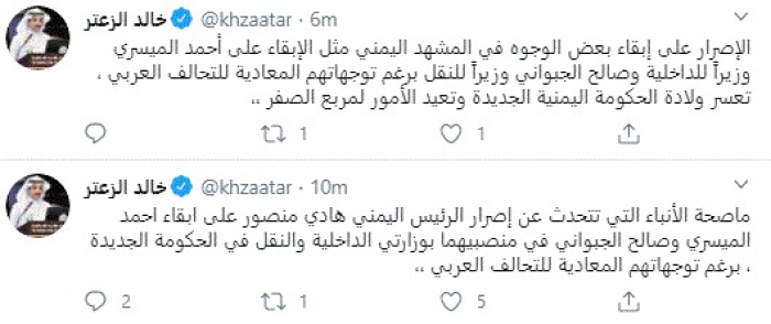وأضاف: "الإصرار على إبقاء بعض الوجوه في المشهد اليمني مثل الإبقاء على أحمد الميسري وزيرًا للداخلية وصالح الجبواني وزيرًا للنقل برغم توجهاتهم المعادية للتحالف العربي، تعسر ولادة الحكومة اليمنية الجديدة وتعيد الأمور لمربع الصفر".
