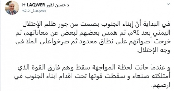 وقال في تغريدة عبر "تويتر" رصدها "المشهد العربي": "في البداية أنَّ أبناء الجنوب عانوا بصمت من جور ظلم الاحتلال اليمني بعد 94م، ثم همس بعضهم لبعض عن معاناتهم، ثم خرجت أصواتهم على نطاق محدود ثم صرخوا على الملأ في وجه الاحتلال".