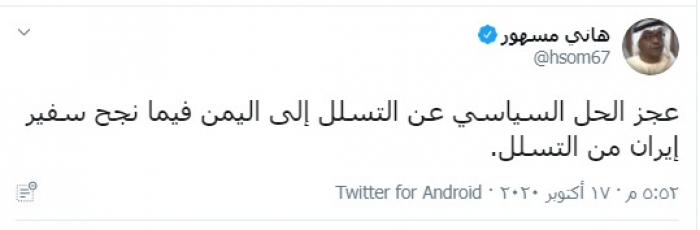 وكتب " مسهور" تغريدة عبر تويتر، رصدها "المشهد العربي": " عجز الحل السياسي عن التسلل إلى اليمن فيما نجح سفير إيران في التسلل".